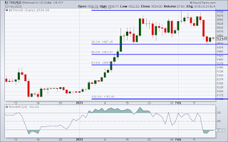 It will be interesting to see where Ethereum trades from here. If the 38.2 % pullback holds or retraces lower to the 50% fibonacci level around 1431. Thank you for reading.Sunday, February 12, 2023